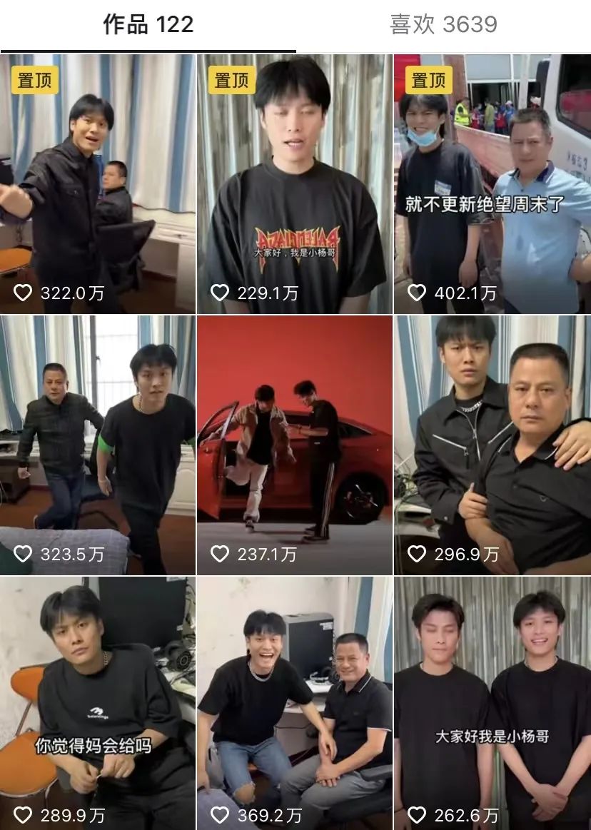 後來,瘋狂小楊哥便聚焦家庭生產內容,哥哥、弟弟和老爸都成為其創作中常出現的素材,塑造了“作死弟弟”“網癮老爸”“暴力老媽”等角色,產出了“為弟弟戒網癮”“弟弟的絕望週末”等系列內容,彷彿抖音版“搞笑一家人”。據新抖數據統計,截至今年4月,瘋狂小楊哥已在抖音創作出23條300萬贊以上的視頻。