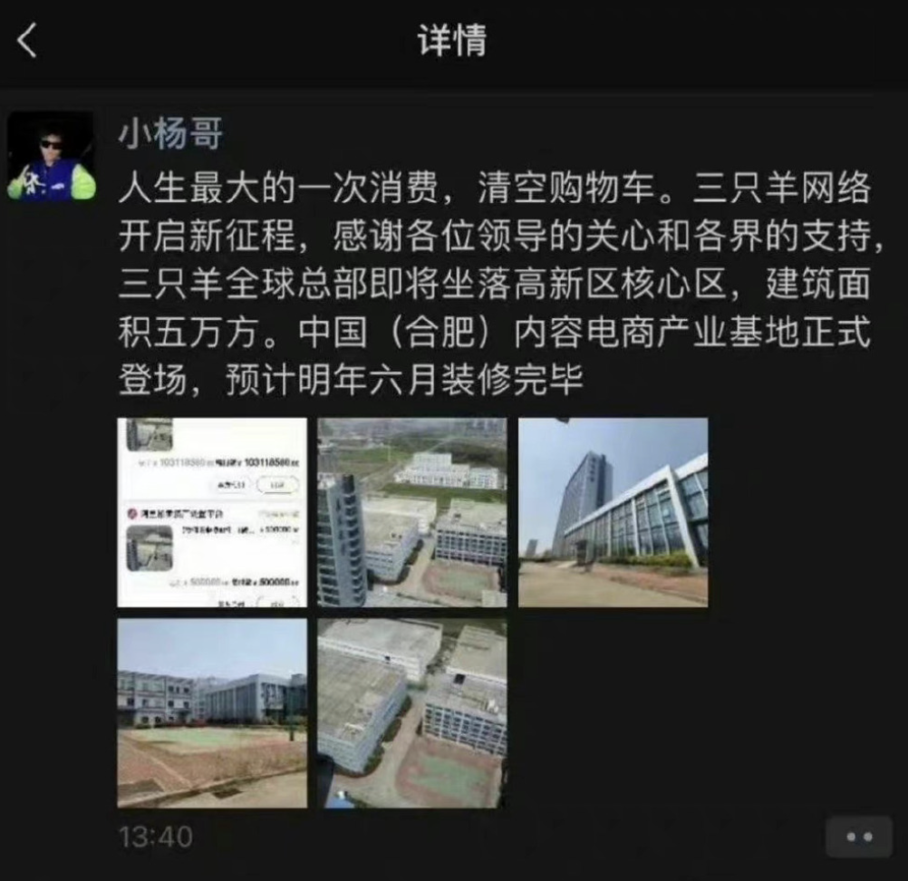 就在今年11月,瘋狂小楊哥買下一棟樓的消息被頂上熱搜。據瞭解,這家廠房的前身是一家專注於光學產品研發的科技企業,小楊哥通過法拍的方式接手了這座廠房。面對“網紅幹倒了高科技公司”這種説法,小楊哥在直播中解釋,是因為公司擴大規模需要。三隻羊官網顯示,三隻羊是抖音、快手十大MCN機構之一,旗下擁有300多個賬號。