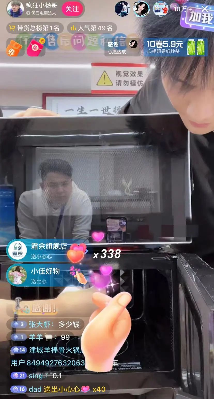 就在遭遇王海打假的這天晚上,11月15日,瘋狂小楊哥在抖音的直播間跟平常一樣帶貨。遇到一款微波爐內燈時亮時不亮的時候,瘋狂小楊哥絲毫不給品牌方面子的來了一句“哎,不亮了”。此時的直播間響起了彷彿情景喜劇的鬨堂大笑聲。