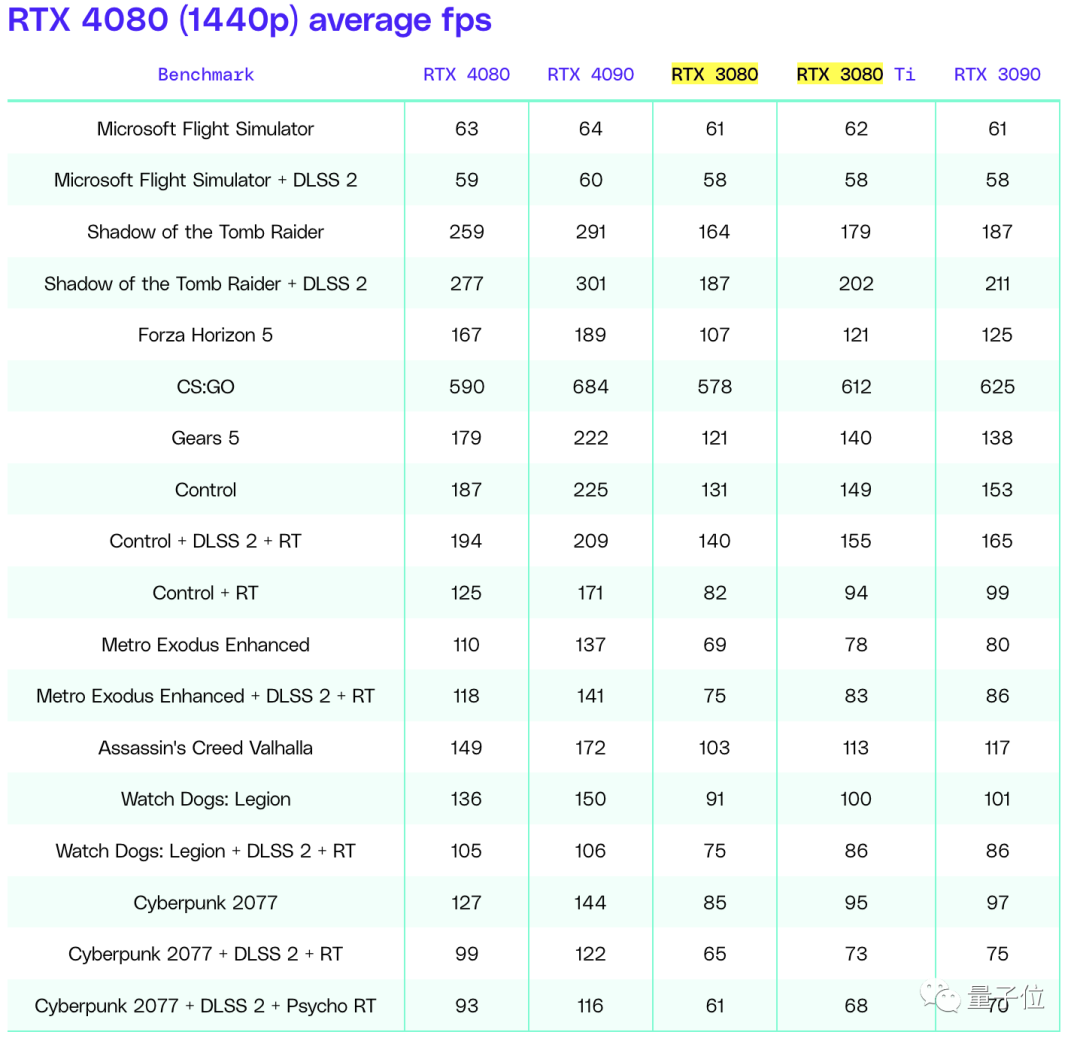 平均而言,RTX 4080在1440p下的幀率(fps)比RTX 3080快50%左右,比RTX 4080 Ti快30%-40%。