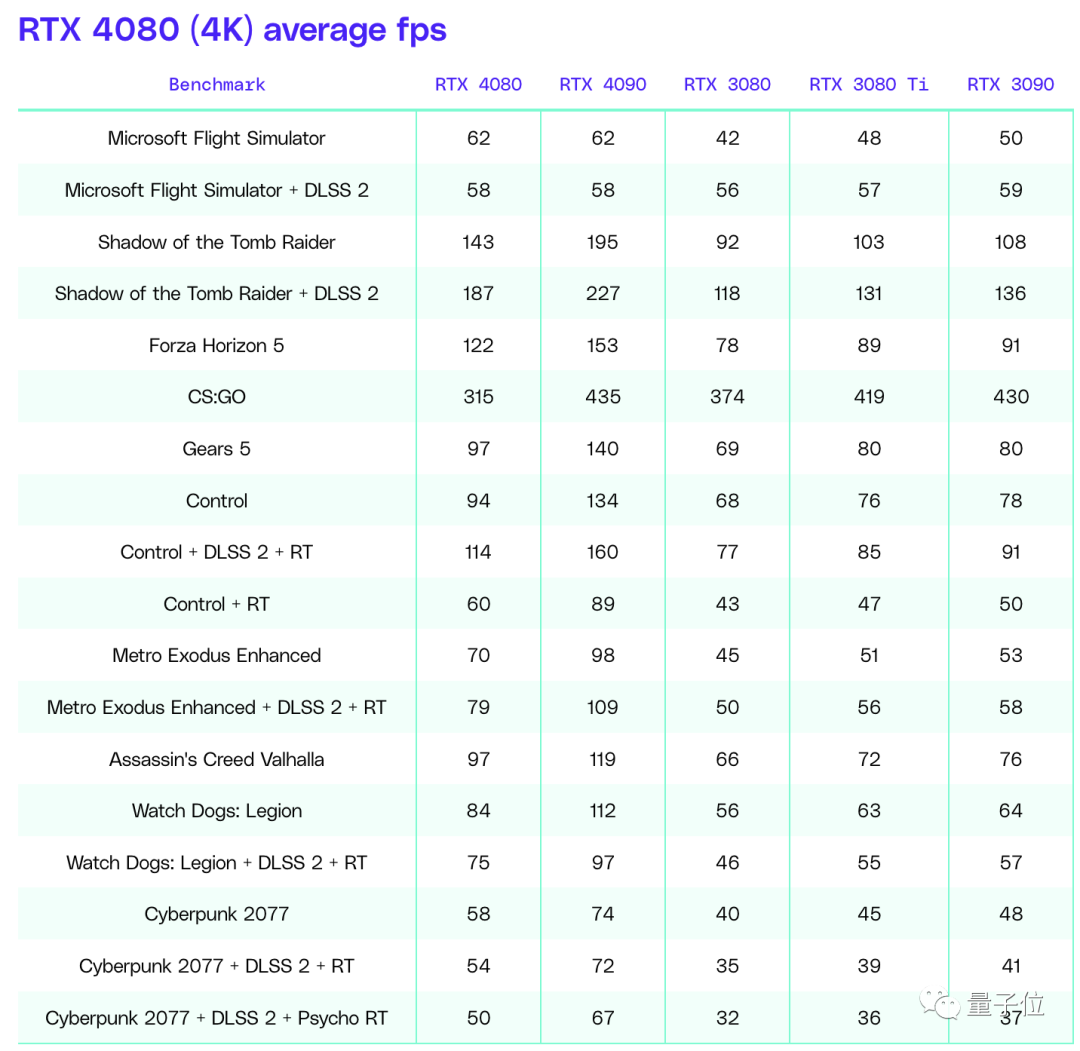 在播放4K遊戲畫面時,RTX 4080依然完勝所有RTX 30系列卡,並且其幀率平均比RTX 3080快50%左右。
