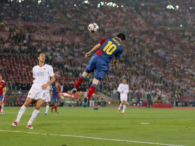 梅西起跳,一個頭球輕點,越過曼聯門將范德薩的手指。2比0。