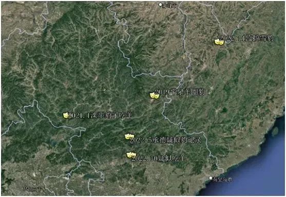 這幾年我們在燕山山地蒐集到了一些信息,有水庫邊手機拍的“疑似豹”,有幾個吃羊的記錄,加上平泉和朝陽的這兩個記錄,我把這些信息的位置標註在地圖上。因為我們一直認為燕山山地可能也還有一些華北豹的未知個體和種羣,雖然主要精力放在太行山,但並沒有放棄對燕山的關注。