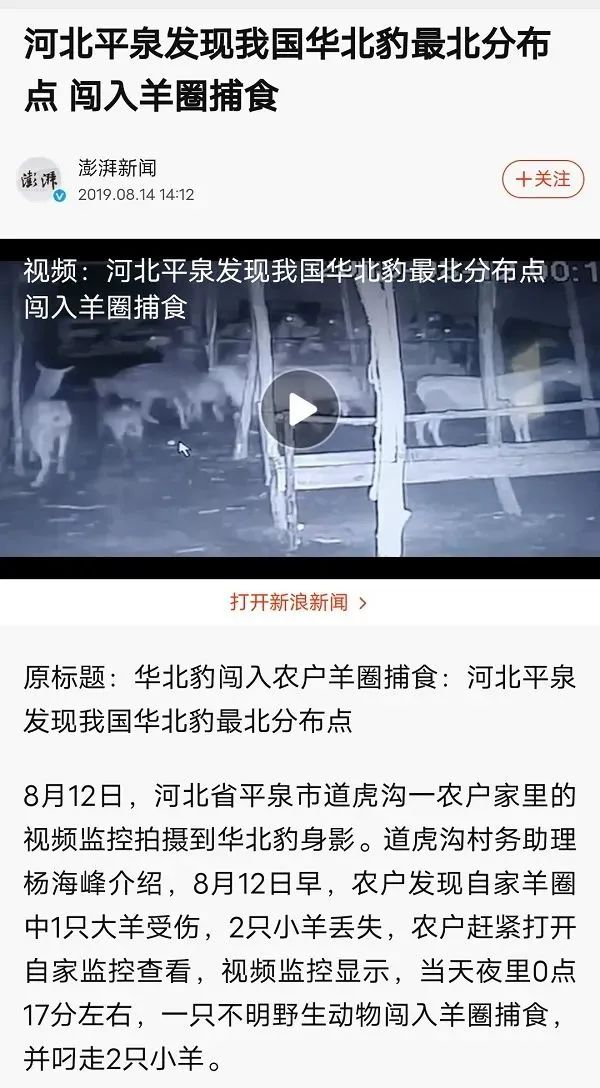 更為恐怖的是,在野貓羣裏確定了這個雪豹的身份後,老蔣忽然醒悟過來,把2019年河北承德平泉的一條新聞《河北平泉發現我國華北豹最北分佈點》翻了出來,説那個“華北豹”莫非也是雪豹?