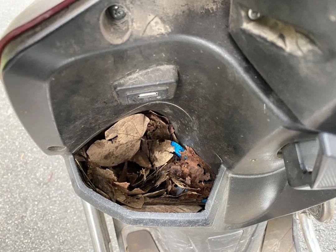 電動車在樓外走廊停了一會兒,白腰鵲鴝便銜了巢材丟進來準備做窩了 © 郭晨微