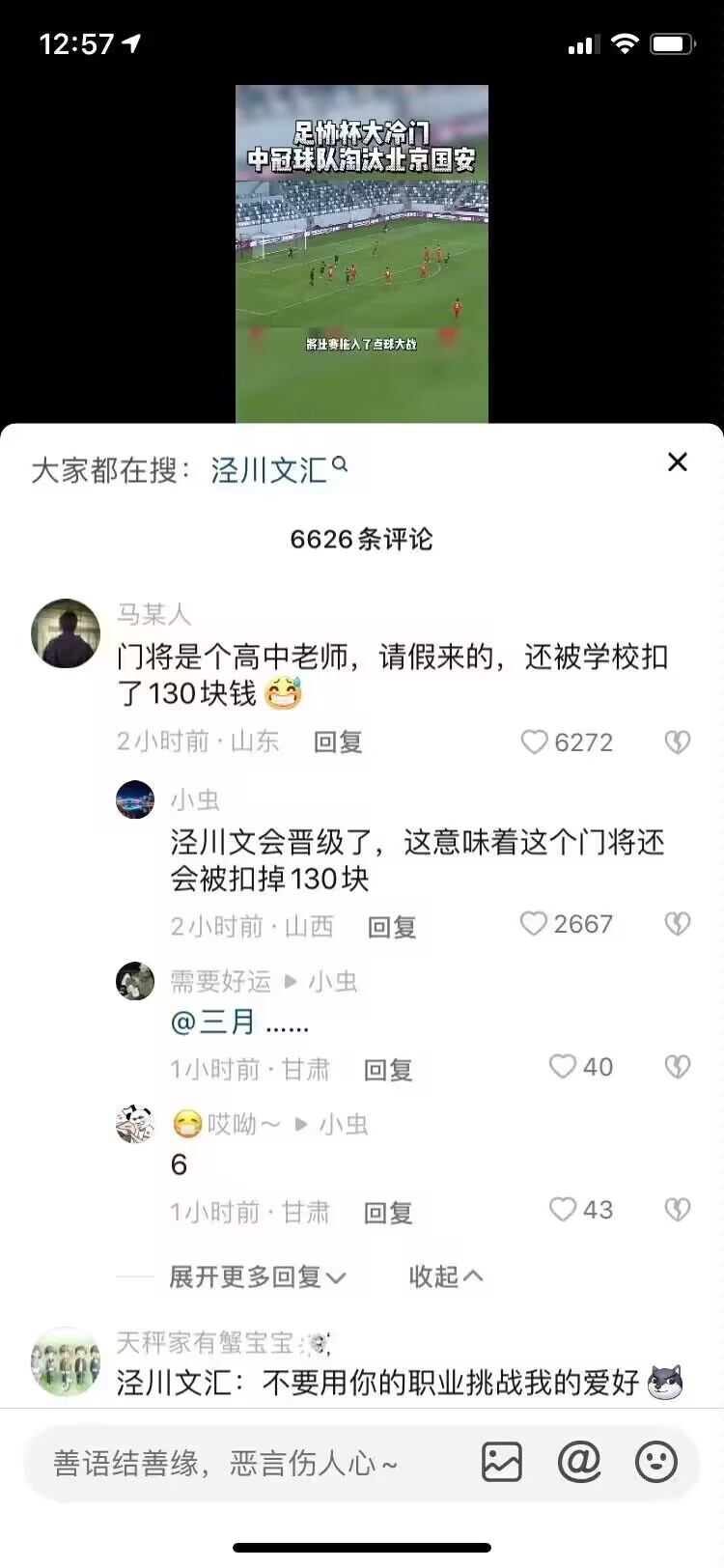 這樣的結果對於我這種不看球的人來説感覺也沒什麼奇怪的,但根據網上很多球迷的説法,這個涇川文匯屬於我國第四級別的球隊,基本屬於是一個半職業球隊。(據説這個球隊大多數都是青訓淘汰球員和退役老將,還有幾個是業餘踢球的體育老師)