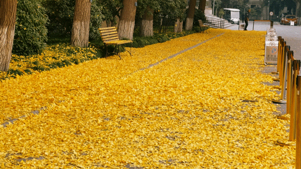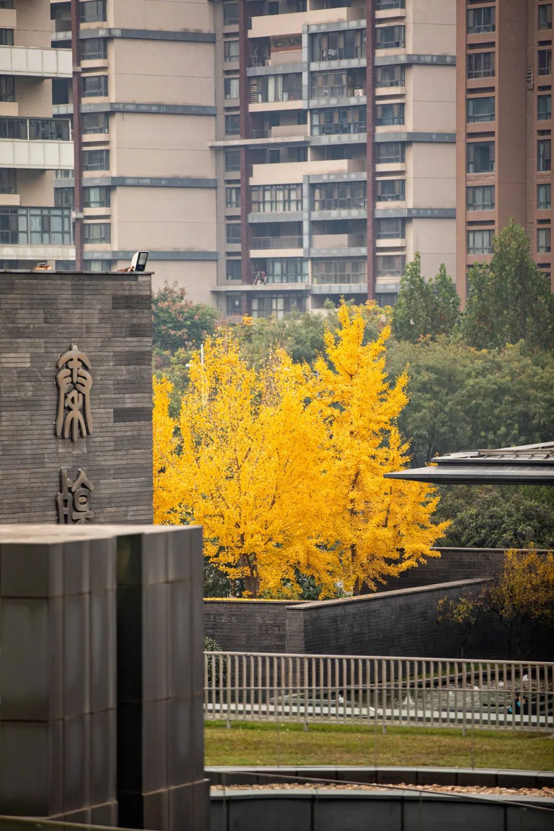 從大門走進來就會看到這排金燦燦的銀杏樹。不遠處就是復古的建築羣,傍晚的陽光灑下來,樹影斑駁,秋意盎然。