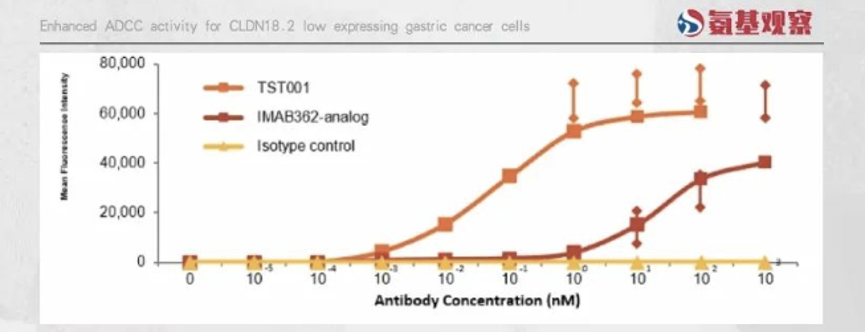 兩大改進,讓TST001擁有了具備超越IMAB362的潛力。如下圖所示,根據創勝集團研究,TST001的ADCC活性優於IMAB362。