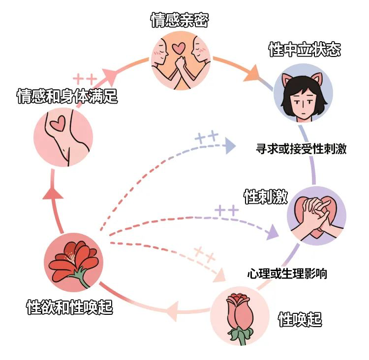 而女性的性反應模型相對複雜,先是通過性接觸達到性喚起狀態,隨後感受到性慾,接着她又會去追求更多的性刺激,進一步增強她的性慾和性喚起,構成了一個循環。