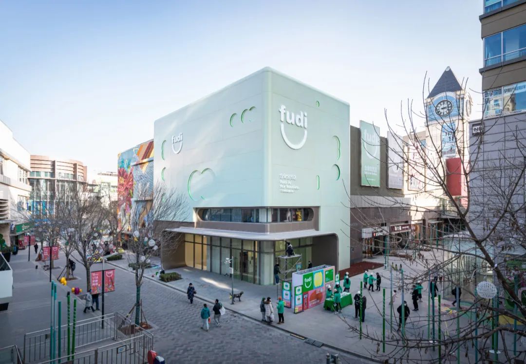 從外觀設計上,Fudi門店參考了網紅店的風格,比如薄荷綠矮樓,網眼狀的外殼,牆面之間的折角呈圓弧,吸引不少消費者前來打卡參觀。