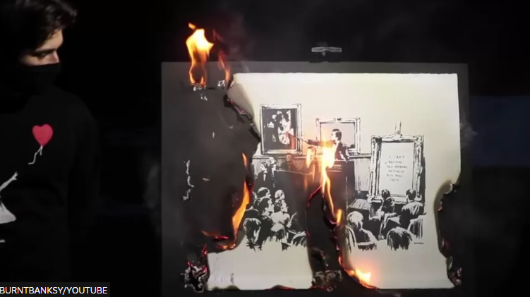 實際上去年NFT圈就已經有類似的案例了。去年三月,街頭藝術家班克斯的畫作《白痴》,被藝術愛好者以“創造性破壞藝術”的名義燒燬,而作品被毀之前,已經用區塊鏈技術做了數字化處理,隨後該畫的NFT在交易平台OpenSea上以247萬美元的高價賣出。