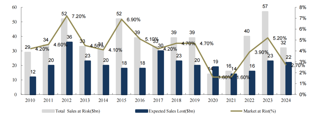 當專利過期後,由於仿製藥企業的集中入局,將會造成該款創新藥價格大幅下降,此前的市場規模也將大幅蒸發,這種由專利到期引發的銷售額驟降被成為專利懸崖。