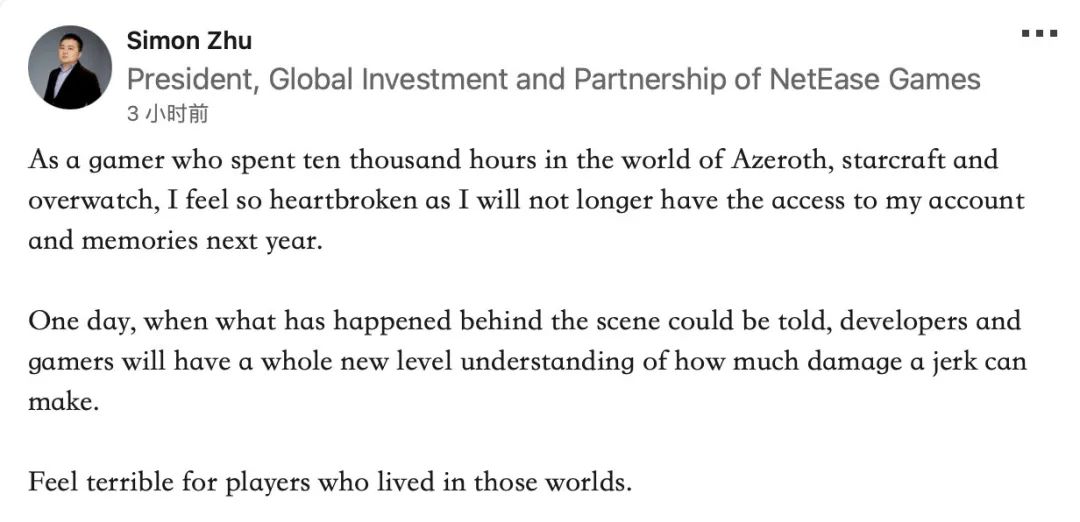 特別是在網易高管朱原的社交媒體上,他更是直言不諱地把矛頭直指某個決策者個人:“有朝一日,當所有的內幕都被揭開,大家會對一個蠢蛋(Jerk)能帶來多大的混亂,有一個全新級別的認知,對所有將要面對此事的玩家感到悲哀。”