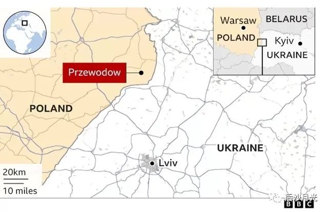 先説導彈爆炸的地點--紅色區塊,波蘭東部盧布林省的普熱沃多夫村(Przewodow),相對烏克蘭來説,該村是在其領土西邊。