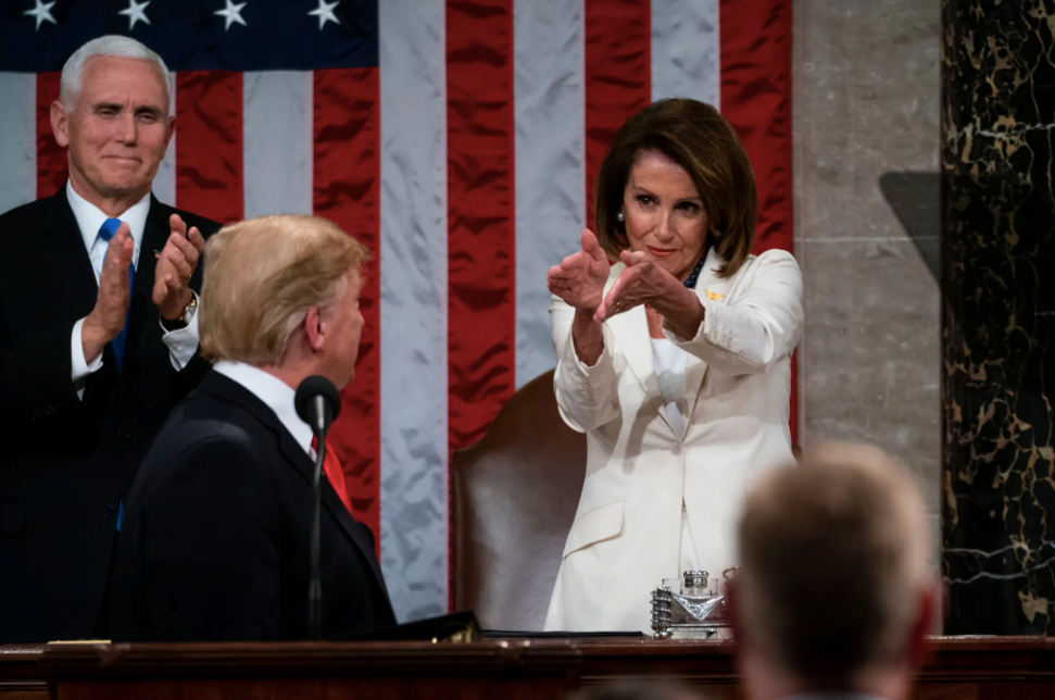 2019年2月,美國總統唐納德·川普在國會大廈發表國情諮文演講時,眾議院議長佩洛西向他鼓掌。