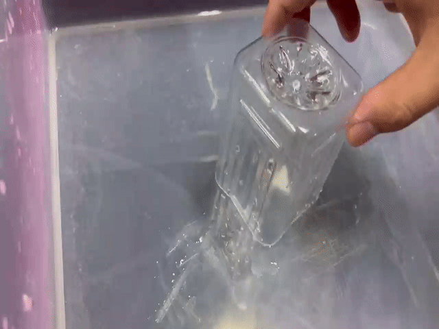 首先讓硬幣保持在倒放的杯子中,輕輕按住杯子,然後向水盆中加水,注意保證杯子裏面的水要比水盆的水面低,同樣移動杯子的同時保持一個斜俯視角觀察杯子裏面的硬幣。