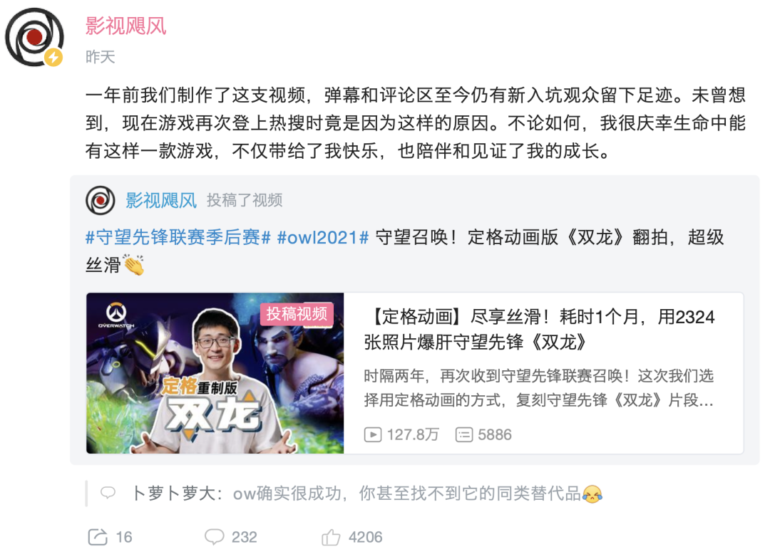 **49、**擁有500萬粉絲的B站UP主“影視颶風”轉發了一年前製作的《守望先鋒》主題定格動畫視頻。