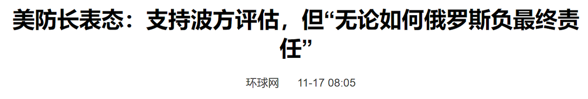 **如果普京不願讓步呢?那也很好操作,這不,美國防長奧斯汀出面“施壓”了,**明確表示,“不管調查結果如何”,“無論如何”俄羅斯都必須承擔“最終責任”,**這也證明了咱們在16日文章中的論斷——“槍口頂在俄羅斯的腦門上”。**網友們認為,拜登都説可能是烏軍“誤射”,那就沒俄羅斯什麼事,這是“意外”,這麼想就“Too young,Too simple”了,同志們想想,美俄談判之際,波蘭導彈事件就發生了,就特麼這麼巧?