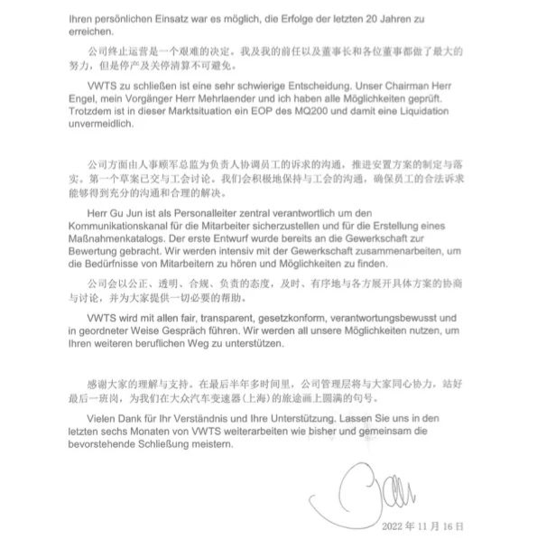 11月16日,大眾汽車交速器(上海)發佈全員信稱,公司計劃於明年3月底正式停產,並在之後將進入關停清算流程。“汽車行業正在經歷前所未有的變革,從傳統的內燃機轉向電動汽車。每個員工每天都會經歷這一歷史性的變化。我們都知道MQ200手動變速箱是我們在VWTS中唯一的產品。未來幾年的生產計劃表明,手動變速器越來越成為小眾產品。”