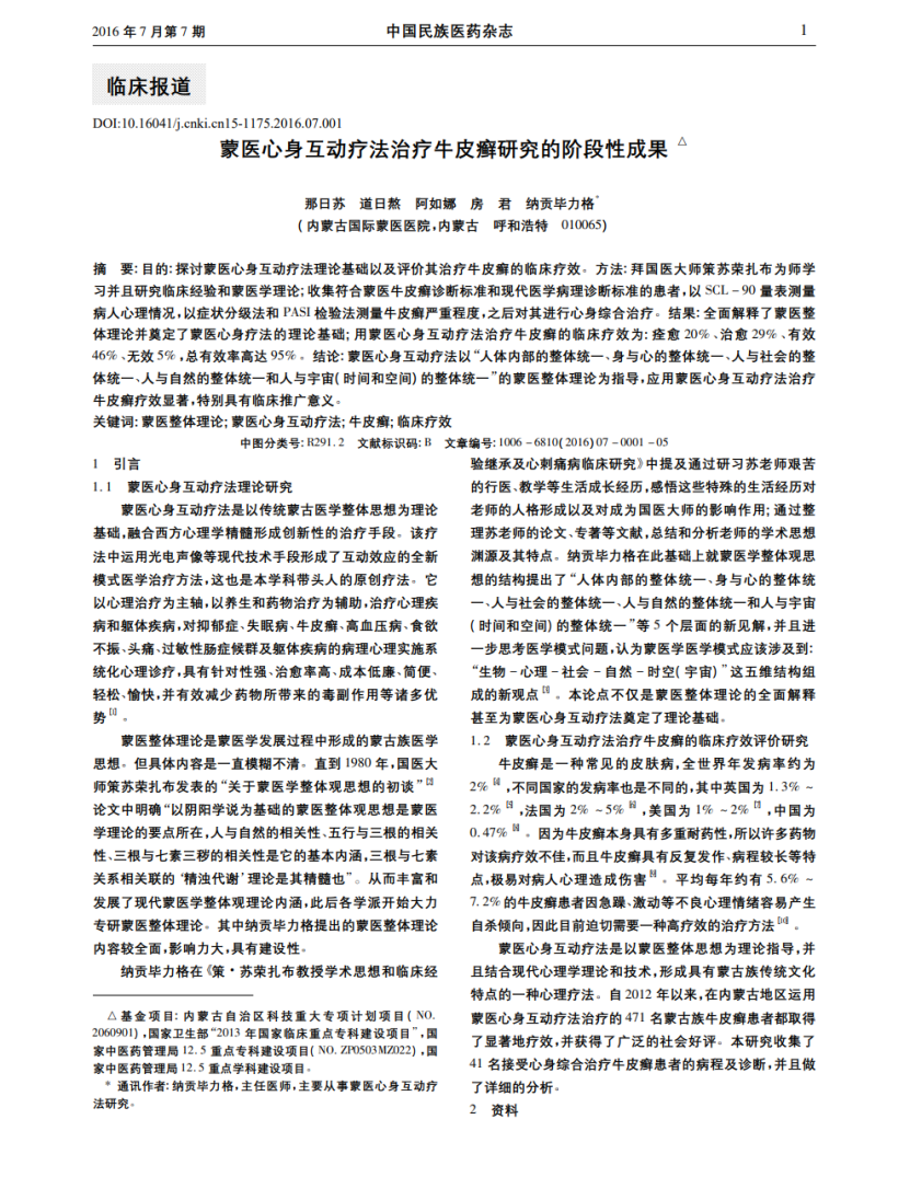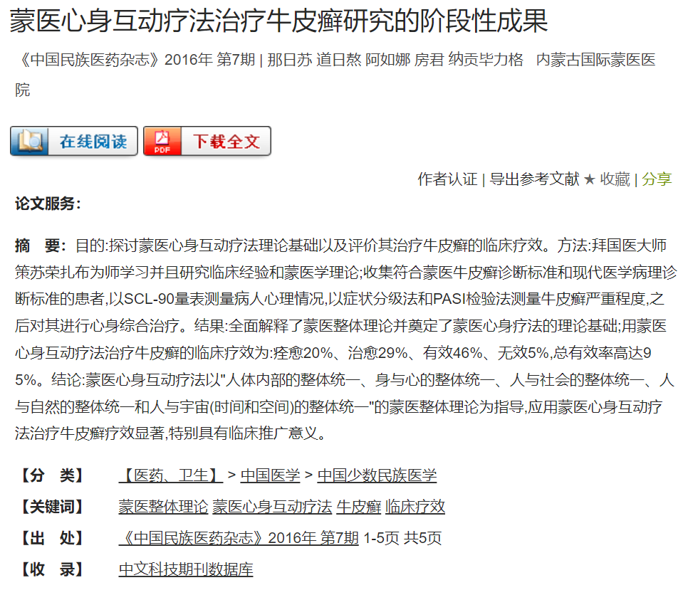“作者從臨牀研究角度證明了蒙醫心身互動療法治療軀體及其心理疾病的良好療效。其中治療牛皮癬的治癒率為20% 、好轉為 29% 、有效為 46% 、無效為5%,****總治癒率高達到95%。”