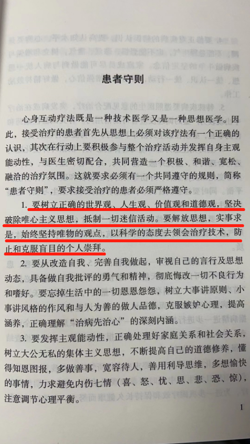 “患者必須樹立正確的三觀,堅決破除唯心主義思想,抵制一切迷信活動,要解放思想,事實就是,始終堅持唯物的觀點,以科學的態度去領會治療技術,防止和克服盲目的個人崇拜。”