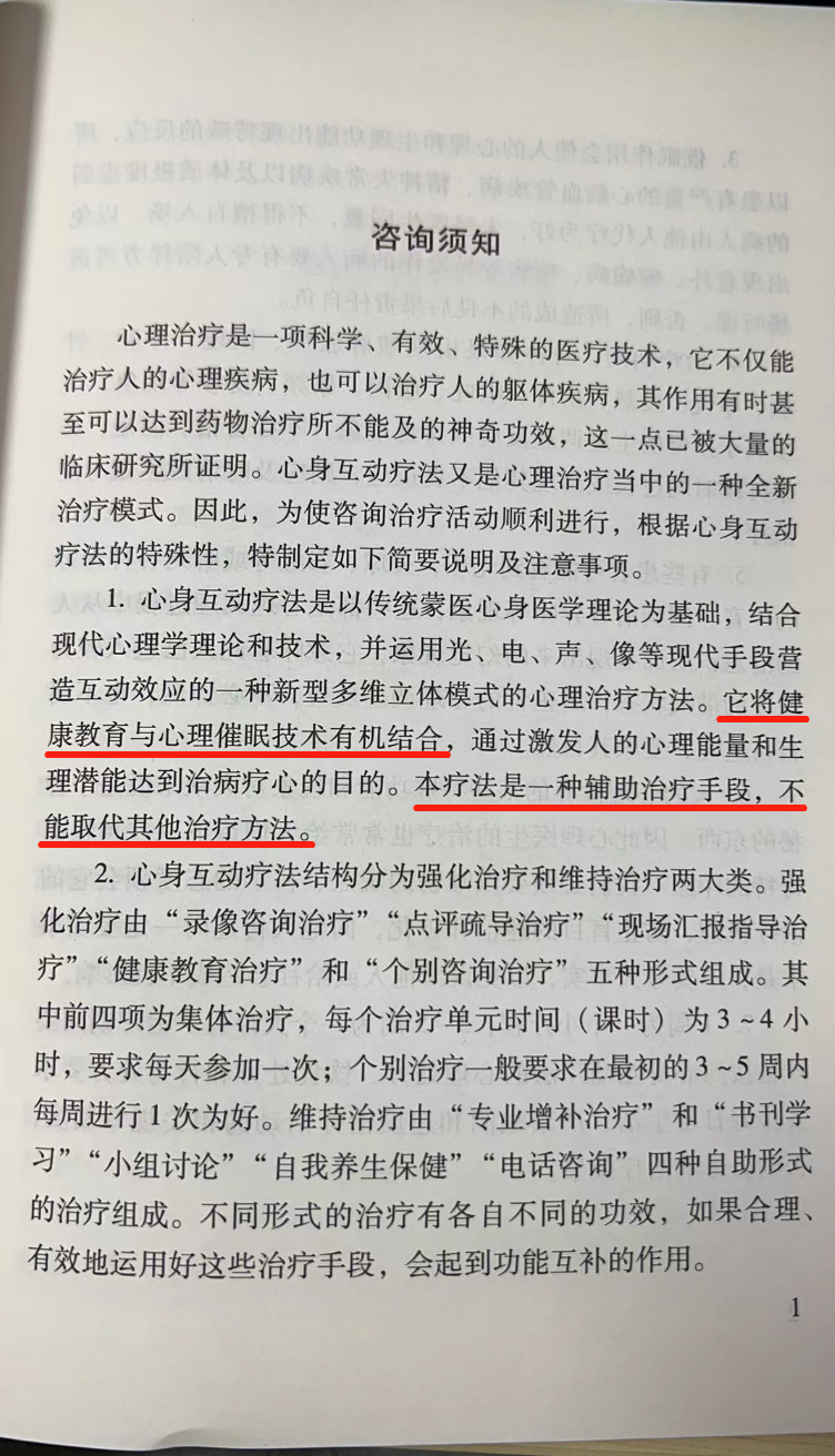 後面還有一篇《諮詢須知》,納貢畢利格再次強調,“他將健康教育與心理催眠技術有機結合**…**本療法是一種輔助治療手段,不能取代其他治療方法”。