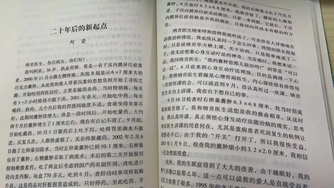 第二個案例是《二十年後的新起點》,講述了一名患有子宮內膜異位囊腫的患者,在吃遍中藥西藥藏藥蒙藥都無法消除囊腫之後,來找納貢畢利格。患者本人是執業藥師,有一定專業素養,但對心身互動療法有牴觸,聽課三個月仍然沒有進展,病情沒有任何緩解。直到某一天,患者突然頓悟,三個月後囊腫縮小了一半。