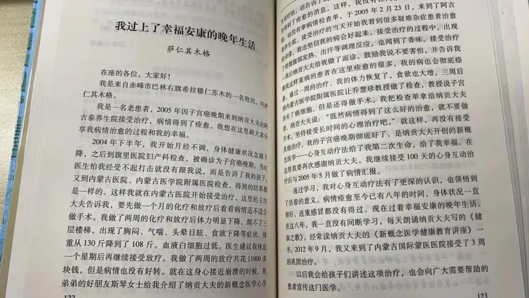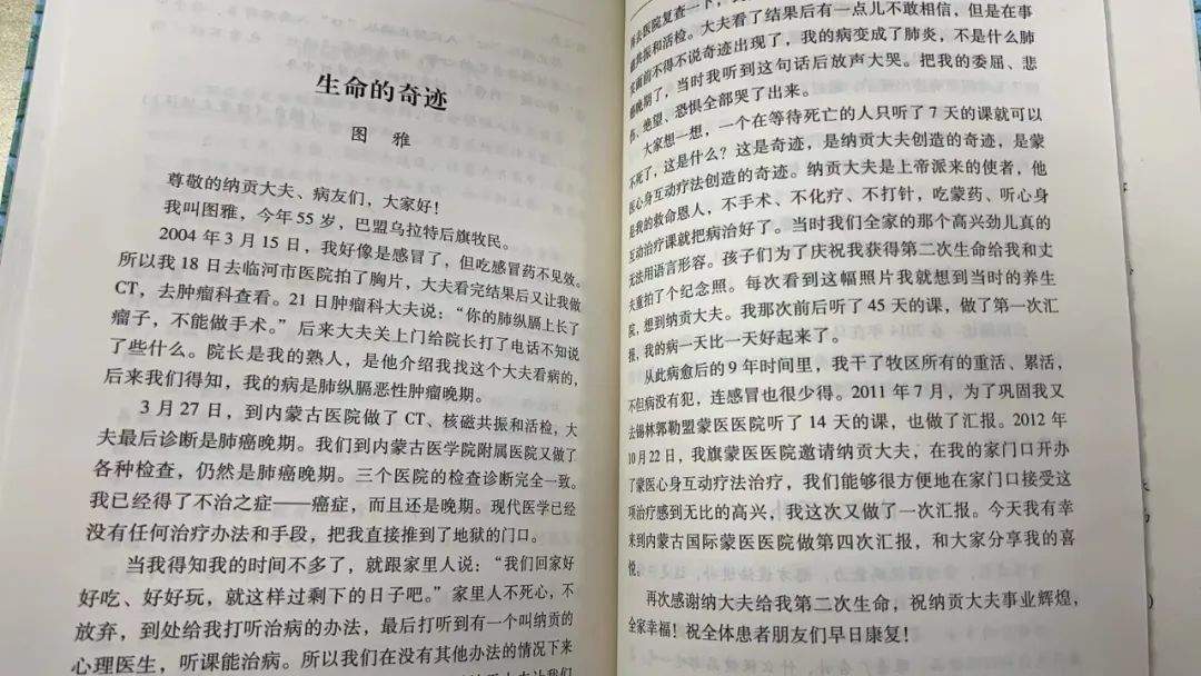 從511期節目的分析看,納貢畢力格喜歡寫論文,一個原因可能是職稱壓力。但和其他醫生不同,他寫了專業論文,還喜歡寫書對大眾宣傳。其中最重要的書是《心靈甘露》。它既是納貢畢利格本人的醫學著作,也總結了成功案例,還是患者聽課的教材。