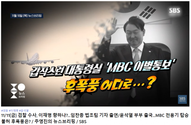 SBS為了給兄弟單位MBC出氣,也給尹大統領整了個狠活兒。在報道尹錫悦出訪的新聞視頻裏,SBS用上了黑白鏡頭,還把BGM弄得相哀樂一樣,搞得大夥兒以為尹總中道崩殂了……