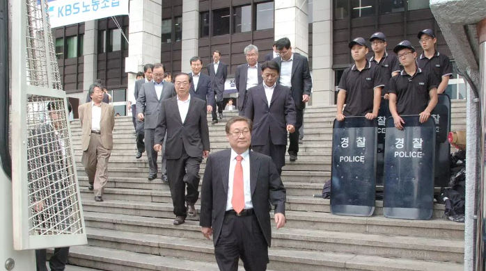 KBS工會和記者協會傾巢而出,年輕記者、編導們高喊着“保衞政治中立,死守公營放送”的口號,在走廊裏與警察肉搏,企圖衝入會場阻斷會議。但李明博方面早有準備,2箇中隊的便衣警察與保衞人員守在會議室外,保障會議正常進行。