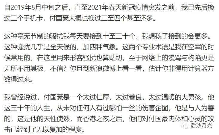 付國豪父親透露,由於遭到無休止的騷擾,付國豪曾經換過至少三個手機號碼。