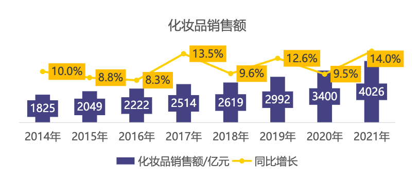 眼下,隨着我國居民消費水平不斷提升,促使我國人均化妝品零售額快速增長,2021年化妝品銷售總額較2020年增加了625.8億元,同比增長14.0%。