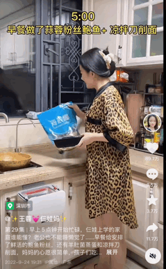10月,抖音美食生活區的達人“王蓉仨娃媽”憑藉“每天5點起牀給老孫煲湯”的標誌性行為實現漲粉百萬,一躍成為網友們的“互聯網媽替”。粉絲飛漲的背後除了其本身內容的爭議底色,也離不開一眾大學生對其的模仿,#全網都在模仿王蓉做飯#甚至衝上了熱門話題。