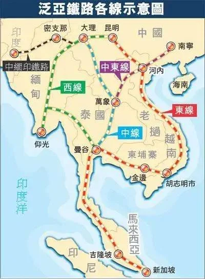 按照中國的規劃,從越南胡志明市還將繼續修建一條穿越馬來西亞的鐵路,抵達新加坡。雖然馬來西亞鐵路線尚未啓動,但是,當中南半島和印尼鋪滿中國鐵路時,馬來西亞就已經沒得選了。