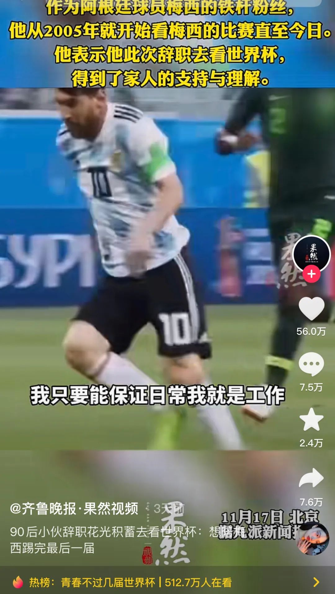 90後小夥陳錚豪辭職看世界盃的新聞,也引發熱議。有人説“青春不過幾屆世界盃”,衝動一把也是不錯的回憶。也有人滿含熱淚:“他一定沒有老婆孩子,沒有房貸車貸,一人吃飽全家不餓。”運動員才不會等你好好掙錢,他們退了就是永遠退了。硬糖君至今還為早幾年沒看上海大師賽錯過費德勒,深為引恨呢!