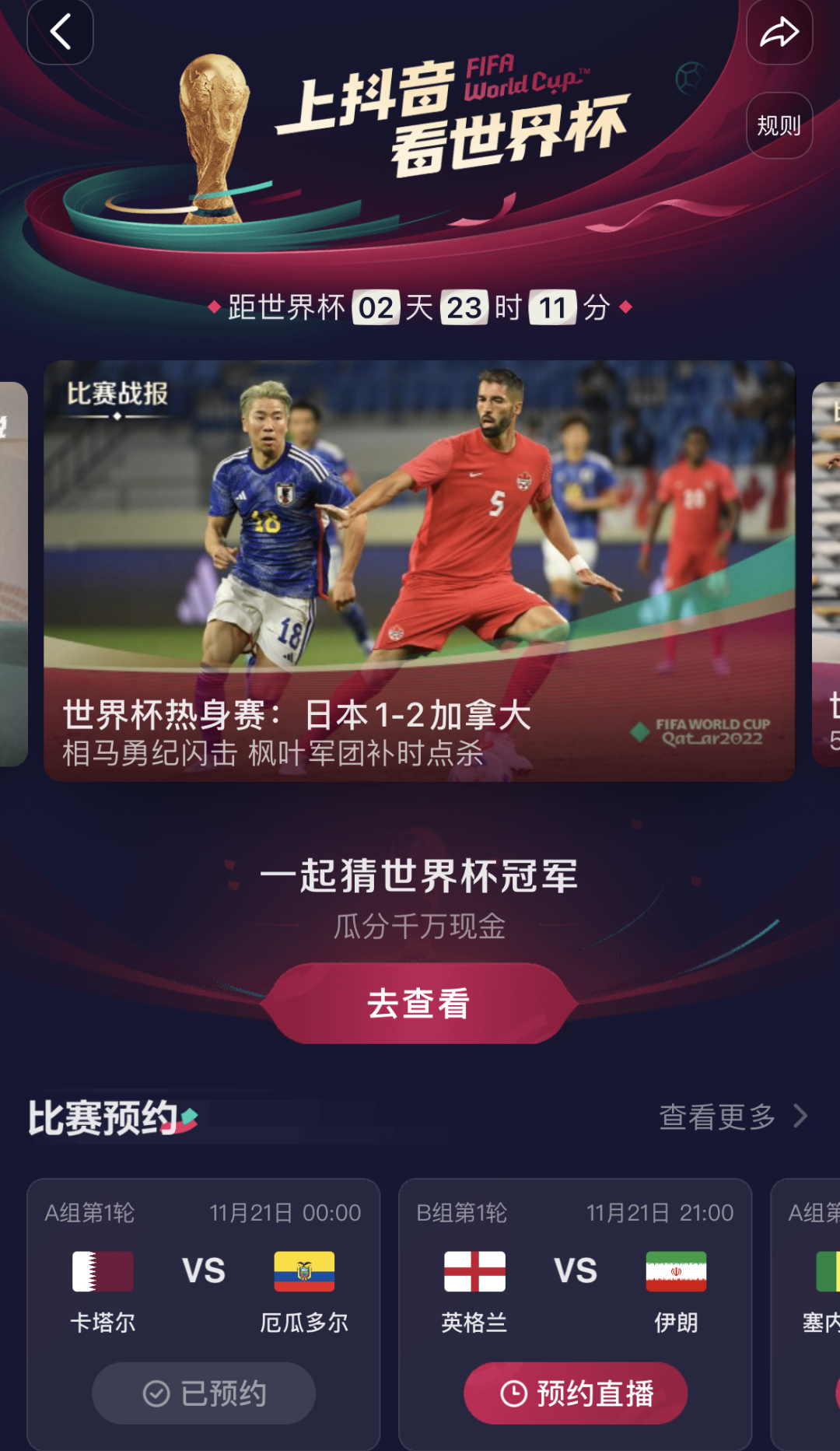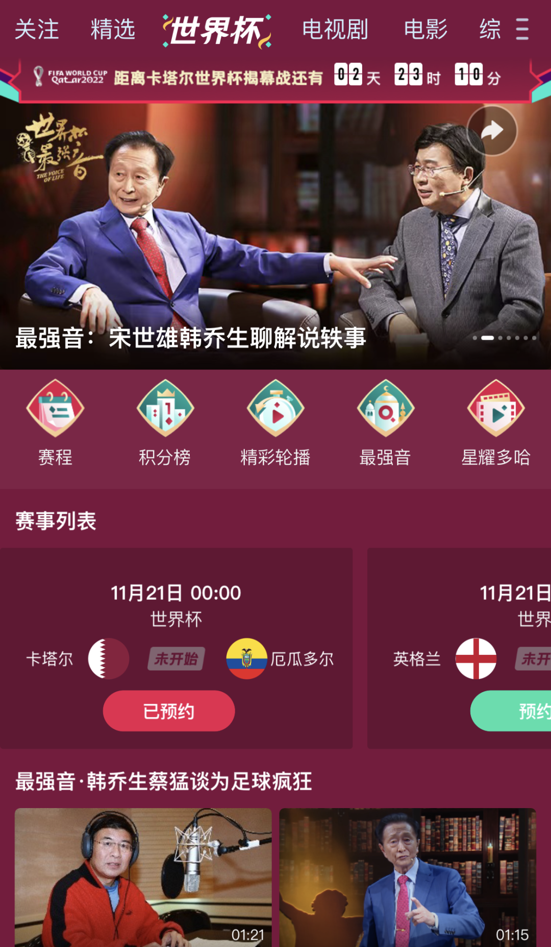 應用內則更加熱鬧:雙方均已上線世界盃專題頁面,倒計時以分鐘顯示。咪咕已經上線星耀卡塔爾、世界盃記憶等8個欄目和《最強音》、《詹前顧後》等多個節目,而抖音則上線了《依然范志毅》、《黃家足球班》等7個官方節目。咪咕請來詹俊、張路等知名足球解説員坐鎮,抖音則有劉建宏、段暄、黃健翔等,竇文濤、姜昆、范志毅等名人也將主持一檔面向大眾的節目。