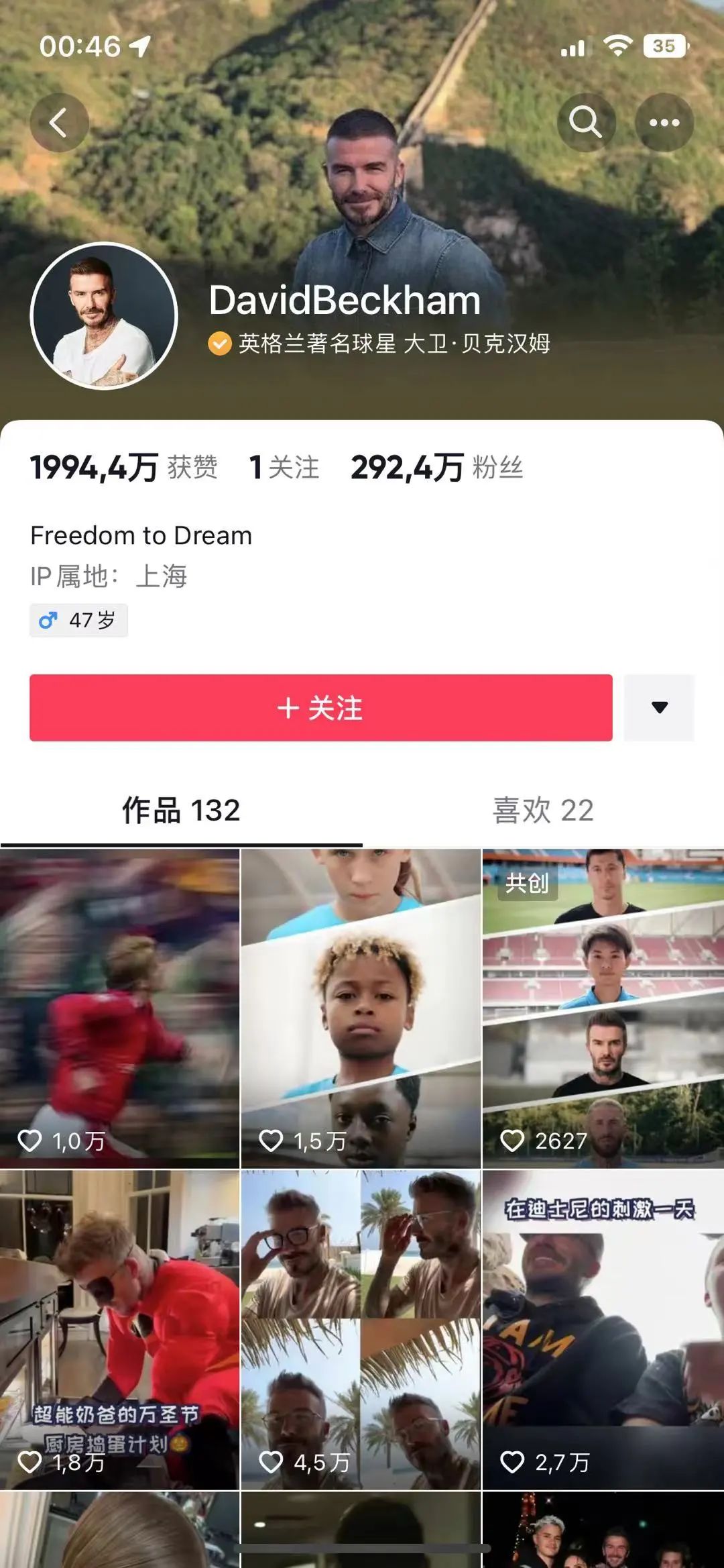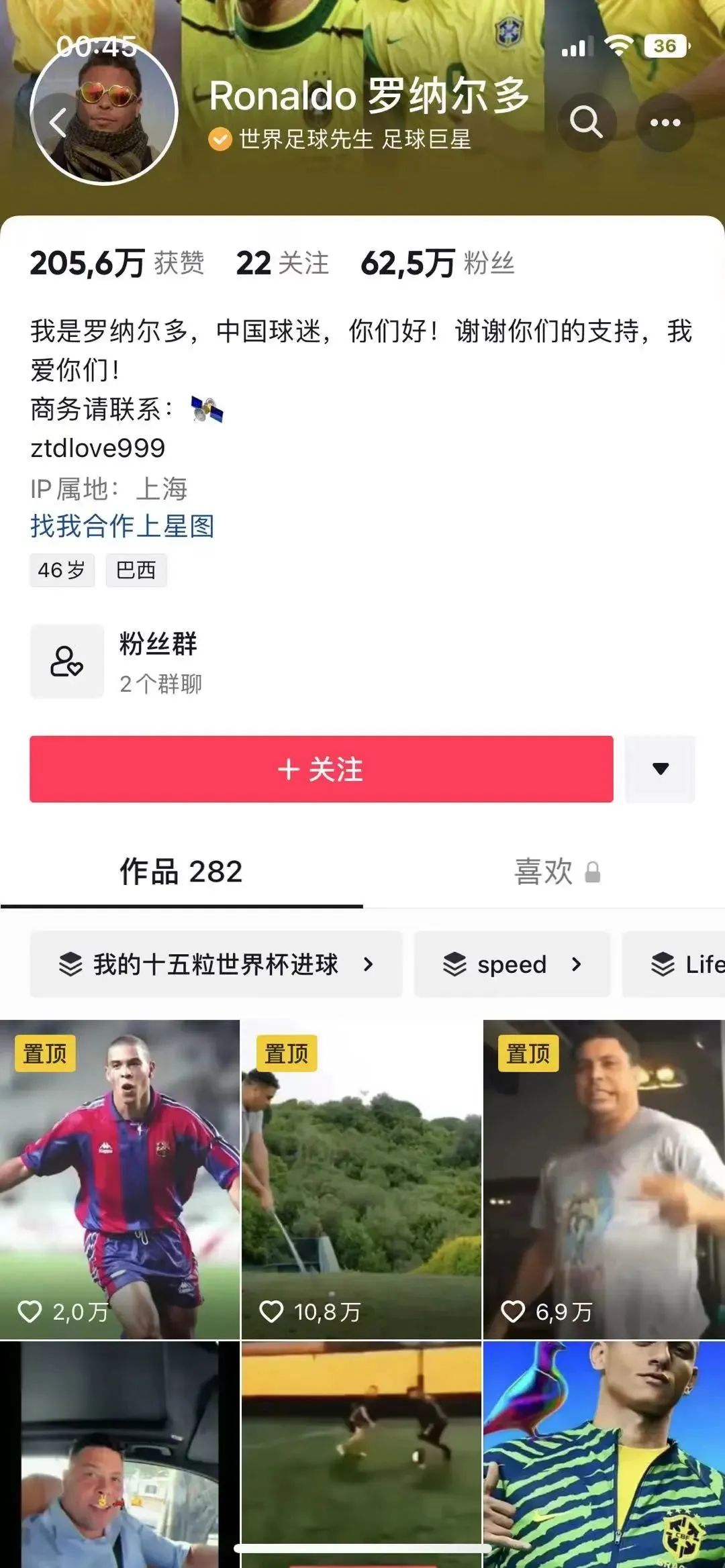 目前抖音世界盃專題頁面的“熱門球星”們,運營的情況參差不齊(但都不算好)。逐一點開看去,貝克漢姆的粉絲量292萬,為箇中最高,發佈了上百個作品。而一代人的記憶“外星人”羅納爾多發佈了282個作品,只積攢了62萬粉絲。