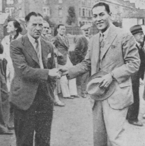 李惠堂和阿森納球星埃裏克斯·詹姆士合影
