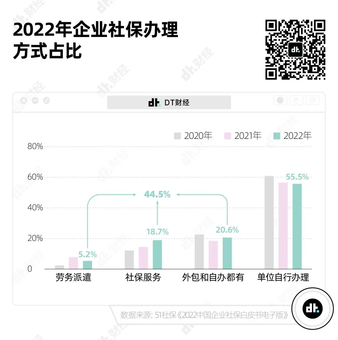 調查顯示,2022 年企業社保純外包率(指“勞務派遣”或“社保服務”)呈現顯著上升趨勢,達到了 23.9%。同時泛外包率(指“純外包”加上“部分外包”)也上升至 44.5%,與之對應的單位自行辦理佔比相比去年下降至 55.5%。