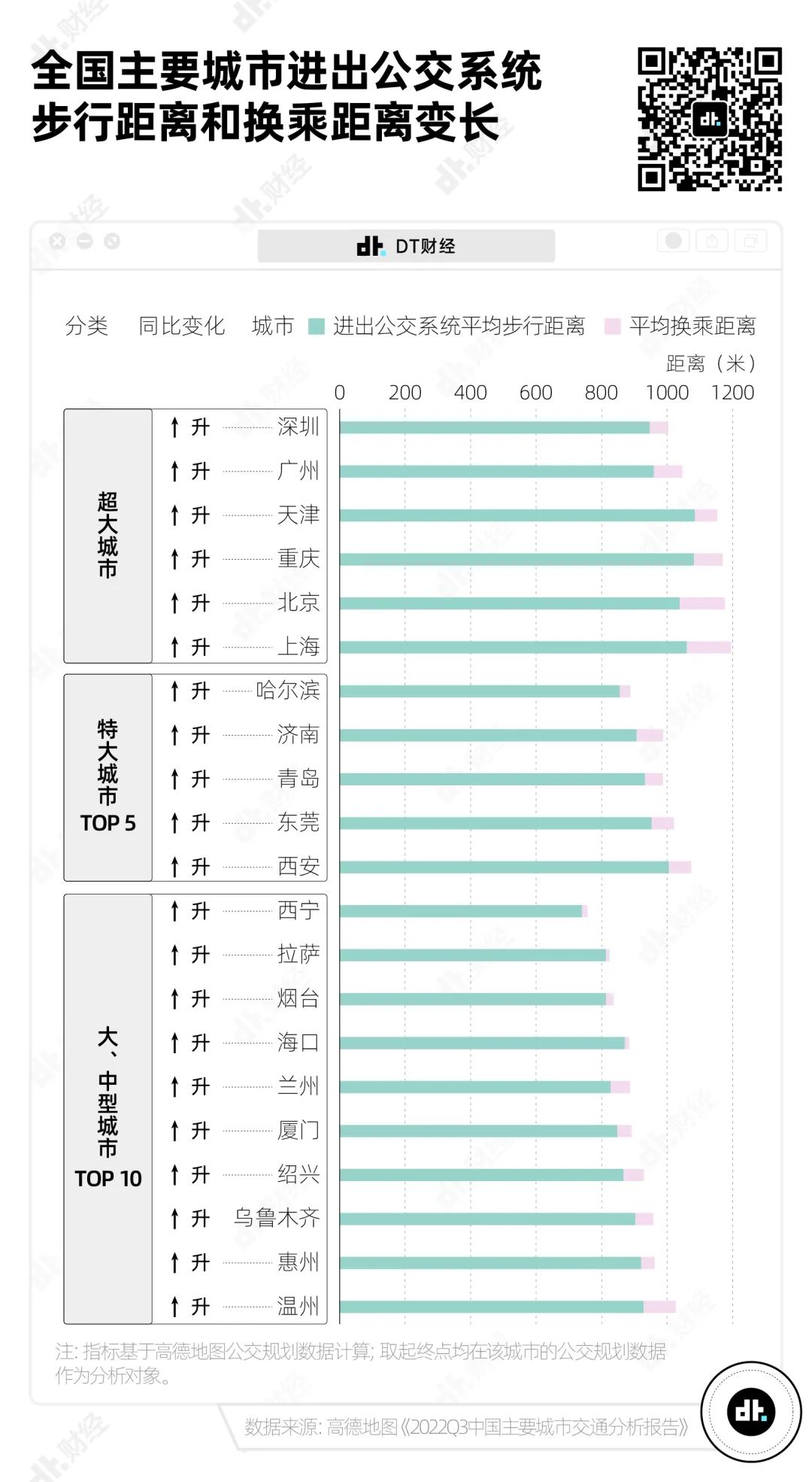 數據顯示,2022Q3期間,在超大城市、特大城市和大中型城市,進出站的平均步行距離(1123 米、1076米、1031米)較去年同期(1073米、1026米、971米)相比呈上升趨勢,且各城市都呈現了略增的趨勢。