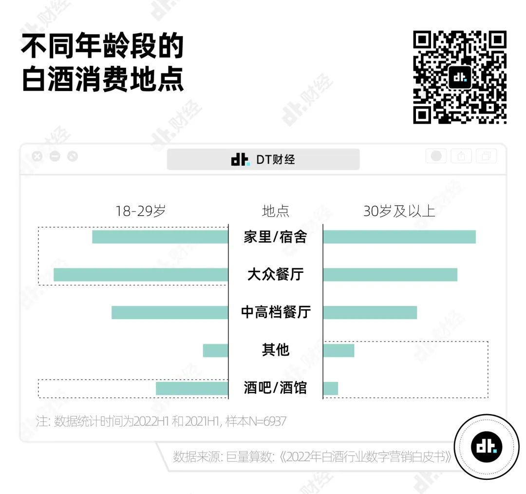 數據顯示,18-29歲的年輕消費者選擇在酒吧/酒館喝白酒的比例遠高於30歲及以上的消費者。