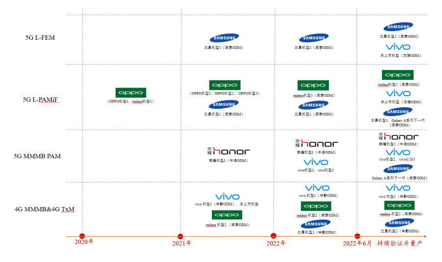 全球市佔率逆勢走高的三星庫存去化都如此“艱難”,其他安卓陣營手機廠商處境可以想見,而值得一提的是,慧智微所打入的三星機型,正是目前庫存去化問題較大的GalaxyA系列,在招股書中,慧智微也將之作為證明公司業務前景的標杆案例:“公司在該領域獲得部分重要機型項目,例如報告期內公司系三星Galaxy A22 機型的5G 新頻段產品的主要供應商,其前代機型Galaxy A21 的出貨量位居2020 年全球前十大暢銷機型;目前公司已經獲得三星Galaxy A 系列下一代機型項目產品供應資格,其前代機型出貨量亦位居2021 年全球前十大暢銷機型”。