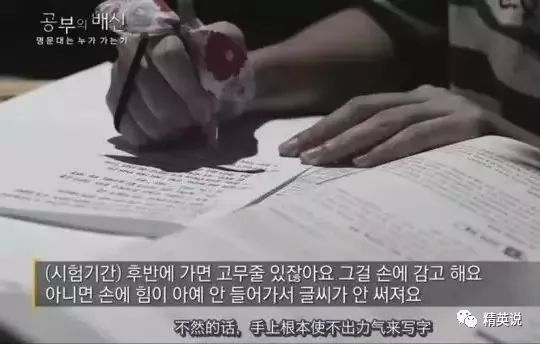 在韓國EBS台推出的紀錄片《學習的背叛》中,一位學生在凌晨兩點仍在奮筆疾書,手指如果使不出力氣了,就用橡皮筋綁住,藉助手腕的力量繼續做題。