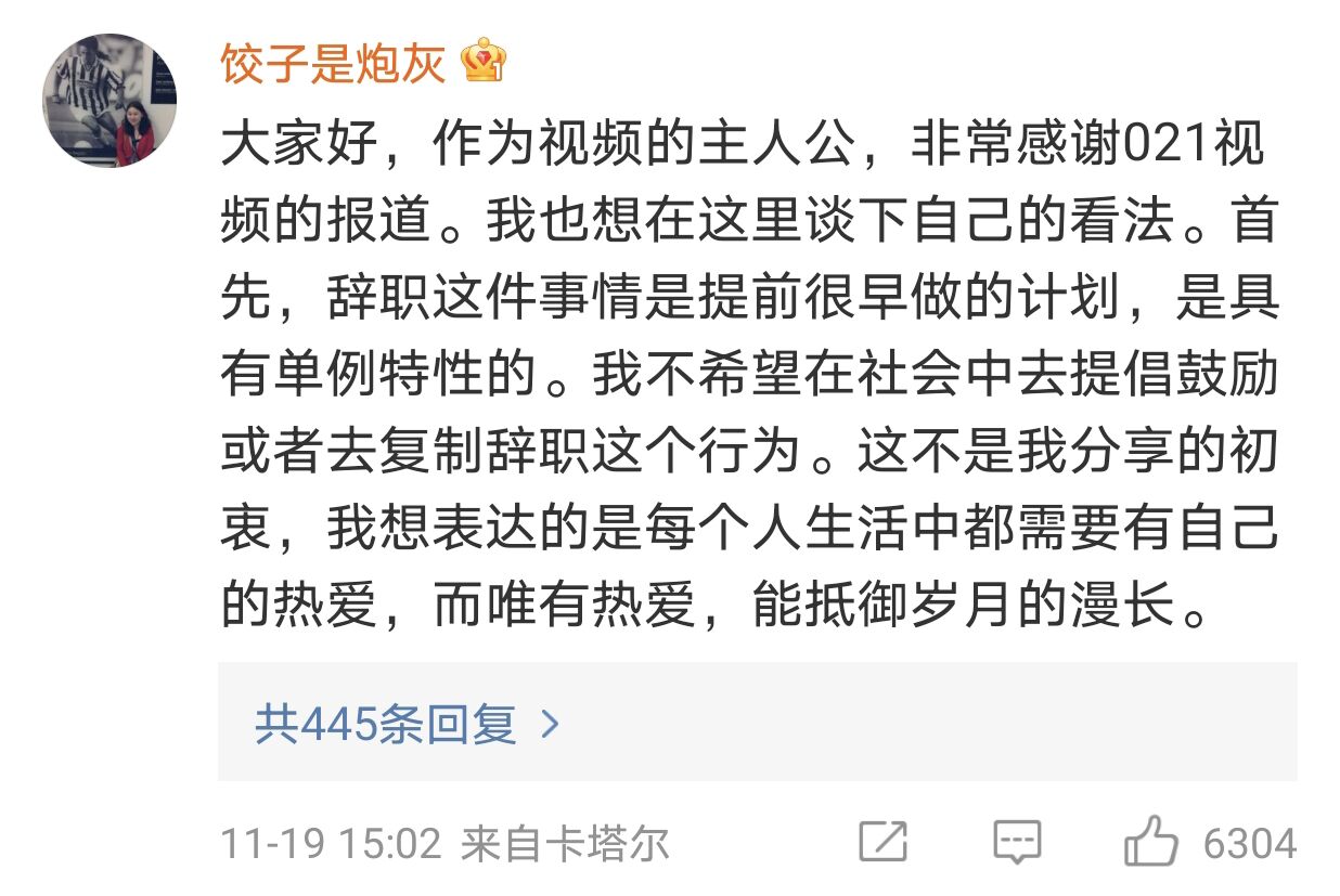 而視頻中的當事人也在相關微博下方的評論區中作了補充,稱自己的辭職其實是很早之前就已經定下來了,自己想表達的是每個人都有去追求自己熱愛事物的權利,但並不提倡或鼓勵隨便辭職這種行為。