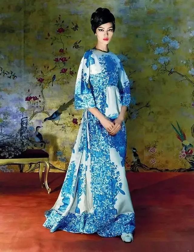 Valentino1969年的時候以中國園林和青花瓷為靈感推出一款藍白印花,1986年又打造了一條青花瓷長裙。