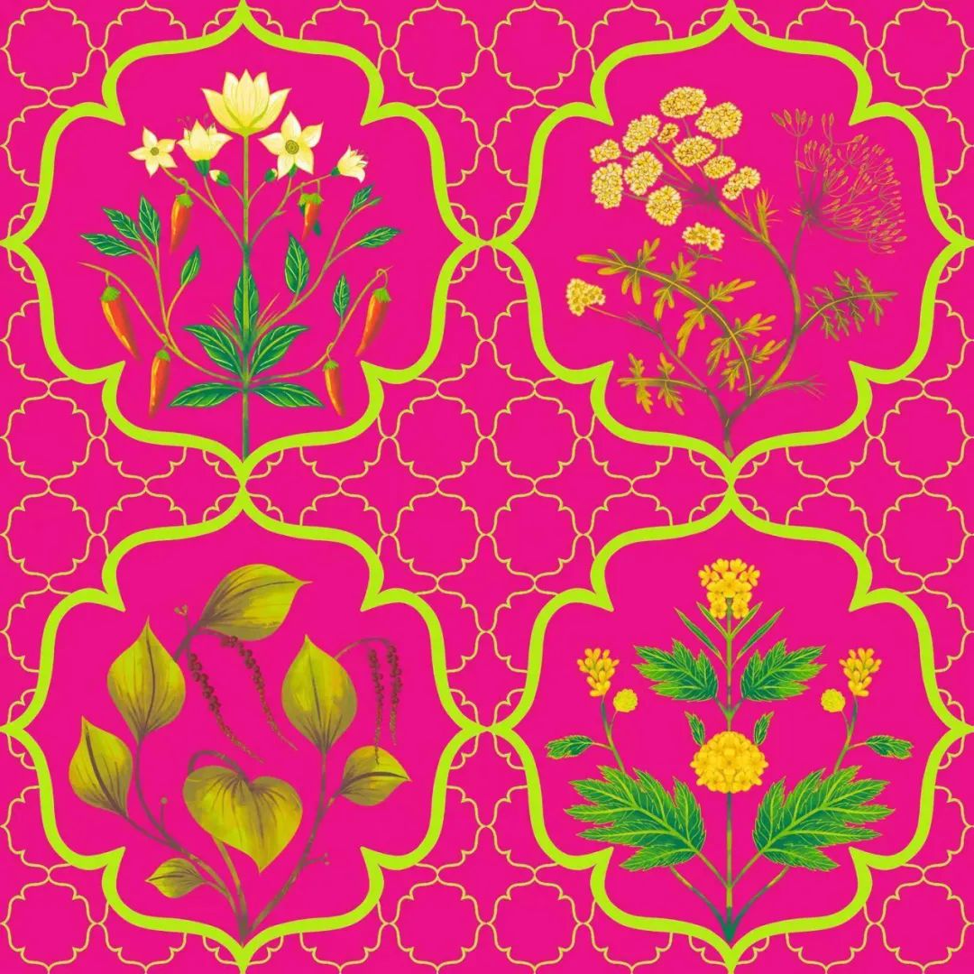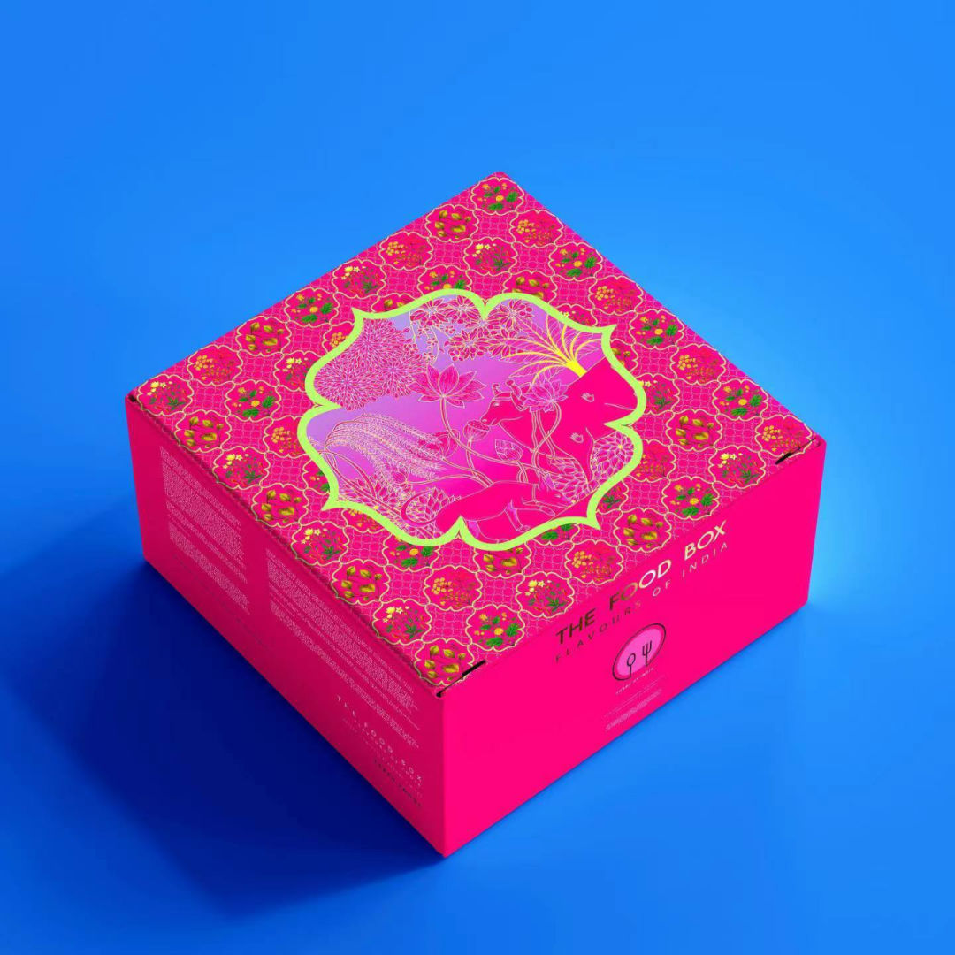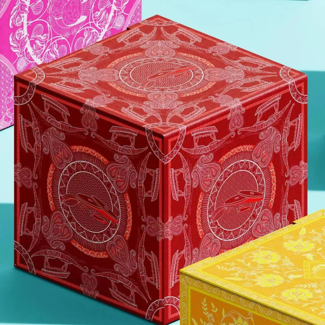 印花圖案來自印度傳統地畫藝術“藍果麗”,這些花紋都是由盒子內香料製作而成。