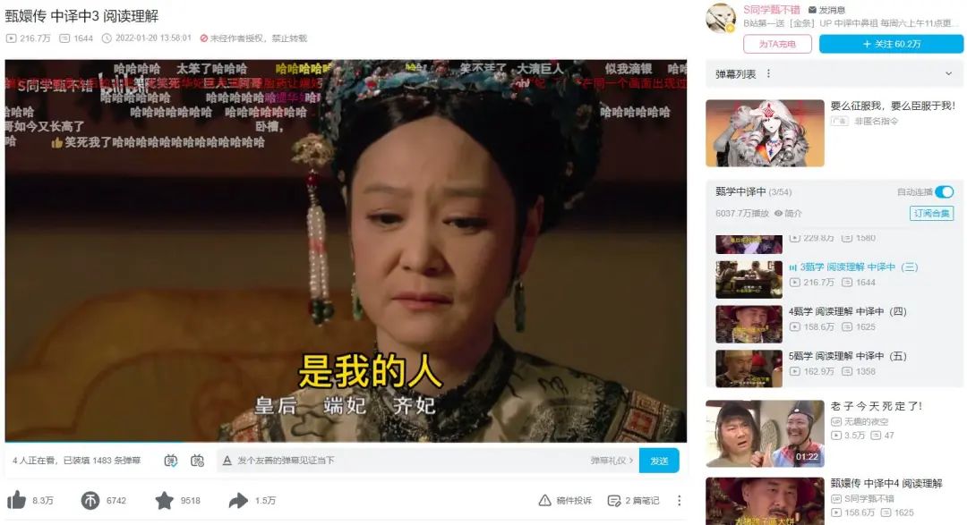 列舉幾個例子,B 站甄嬛相關視頻,播放量百萬的數不過來;