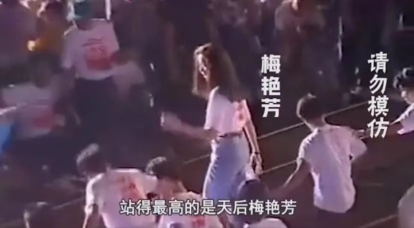 成龍、劉德華等幾十個演員搭成一道人牆,作為人牆中唯一的女性,梅豔芳主動站在人牆的最高點。