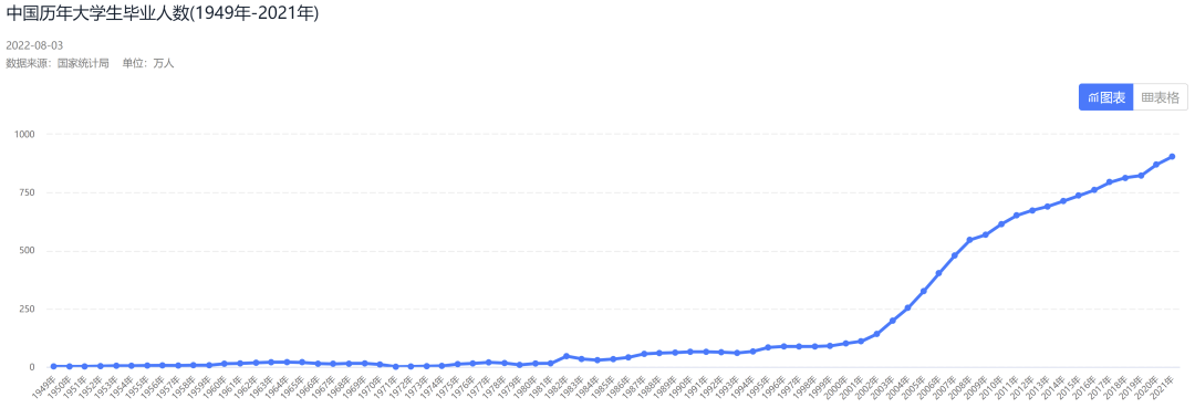 那時候大學生可真的是天之驕子,比如1983年,全國只有33.9萬人從大學畢業,各行各業都缺人,內卷少得不得了。問題從什麼時候出現的呢?