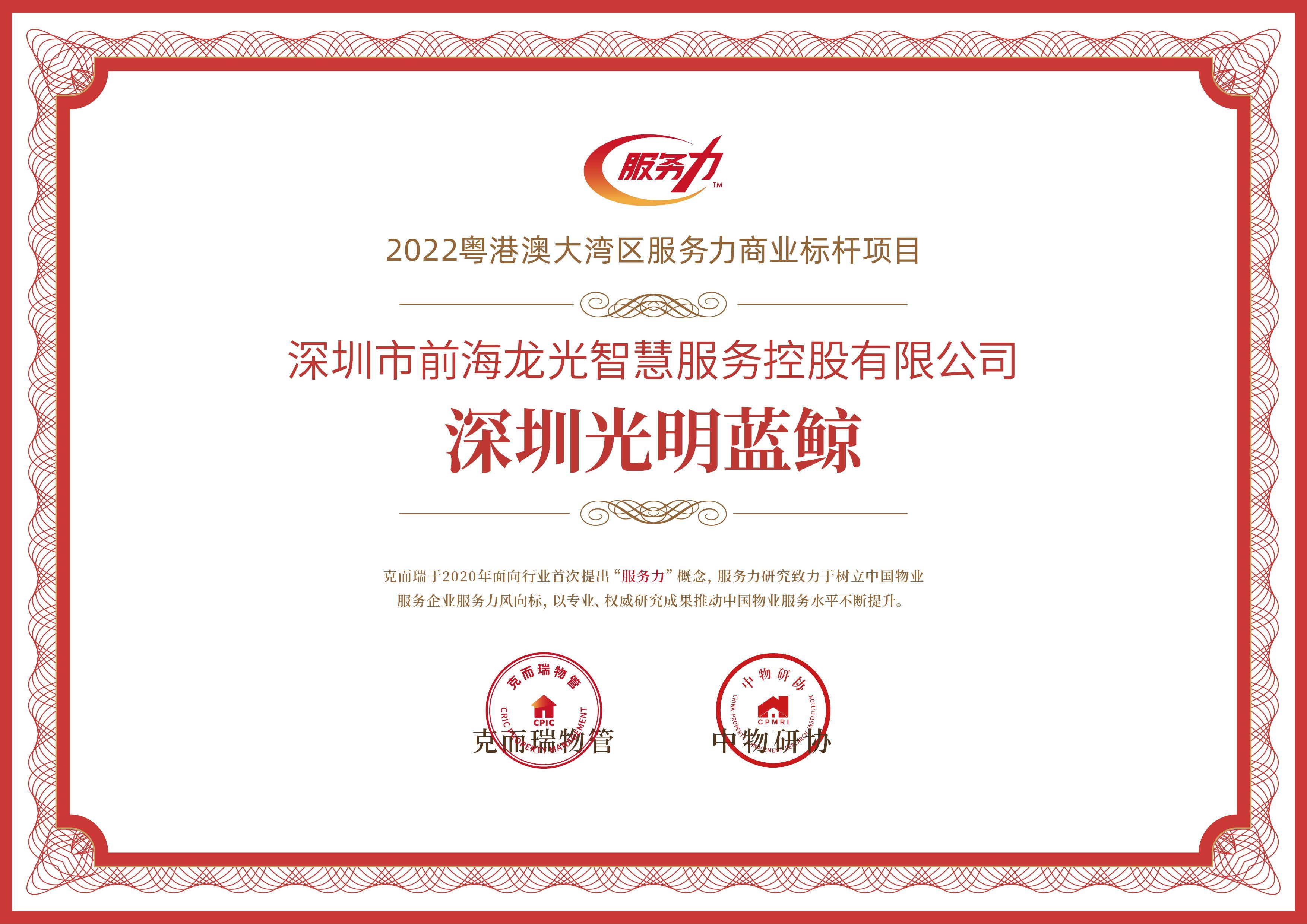在22日舉辦的《2022中國物業行業高峯論壇及城市服務論壇》上,龍光智慧服務憑藉高品質服務,獲評“2022粵港澳大灣區物業服務力百強企業”“2022粵港澳大灣區住宅物業服務力TOP10企業”“2022粵港澳大灣區商業物業服務力TOP5企業”,旗下深圳龍光玖龍台、深圳光明藍鯨分別獲評“2022粵港澳大灣區服務力住宅標杆項目”“2022粵港澳大灣區服務力商業標杆項目”。